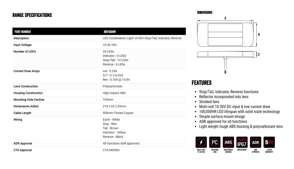 BR218 Series LED combination lamps are a complete all-in-one fit and forget solution. Featuring smoked lenses, built in reflector, and a simple surface mount, the BR218 Series add a touch of class to your truck, trailer or ute. Delivering the durability of maintenance free technology, they provide greater visibility for increased safety and minimum current draw. Constructed with durable polycarbonate lenses and ABS housings, the BR218 Series is designed and built to survive the toughest environments.